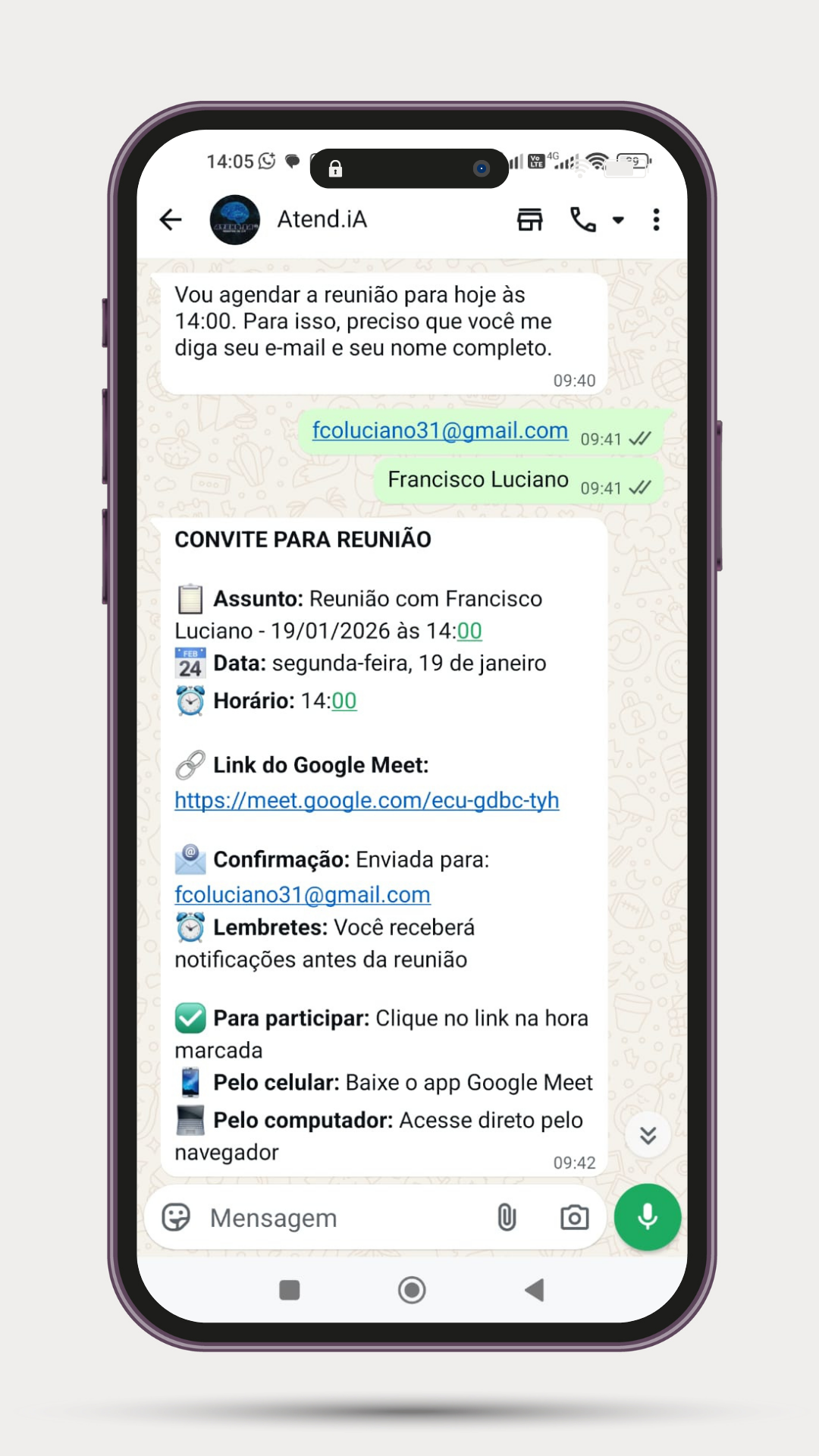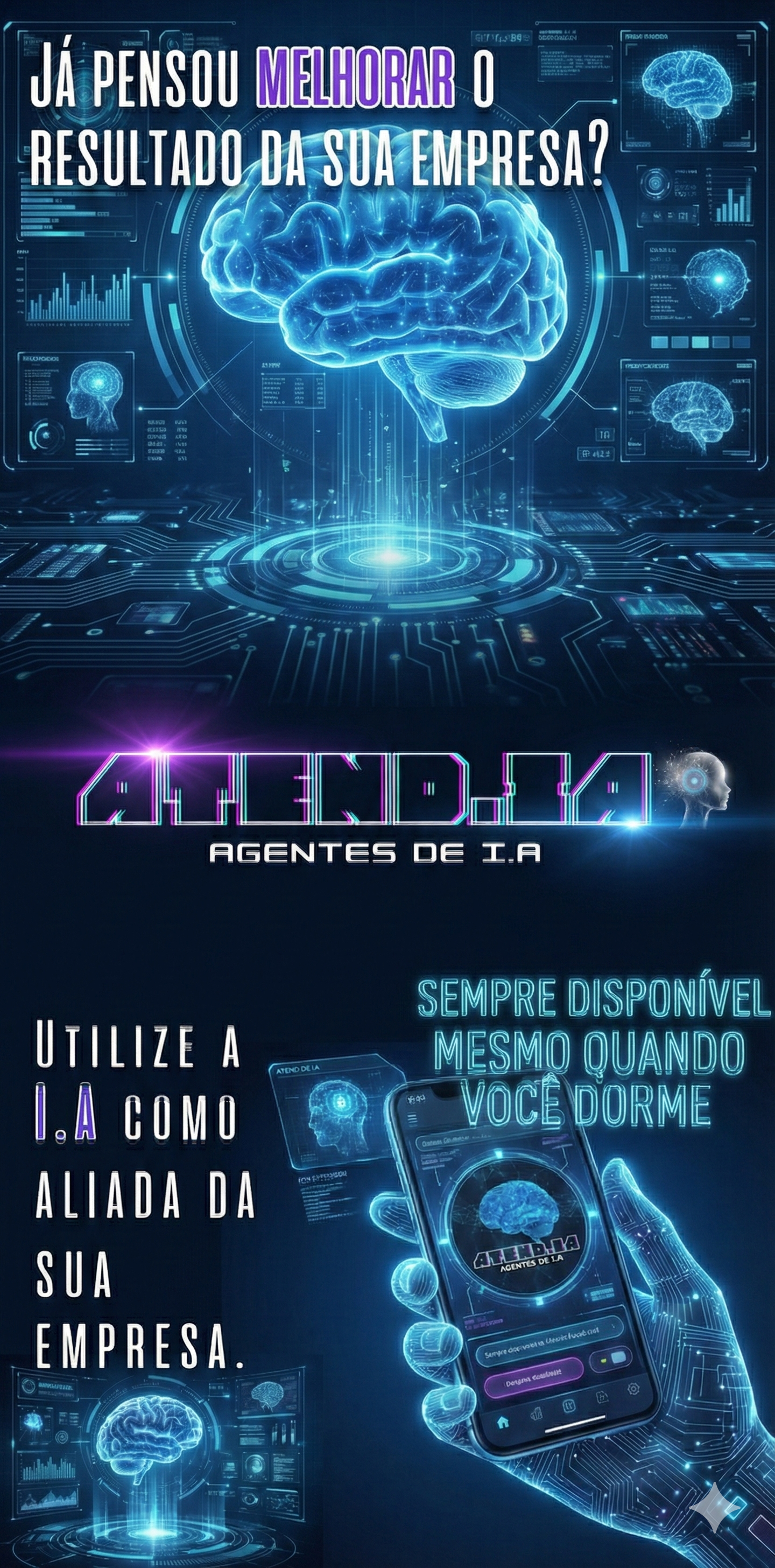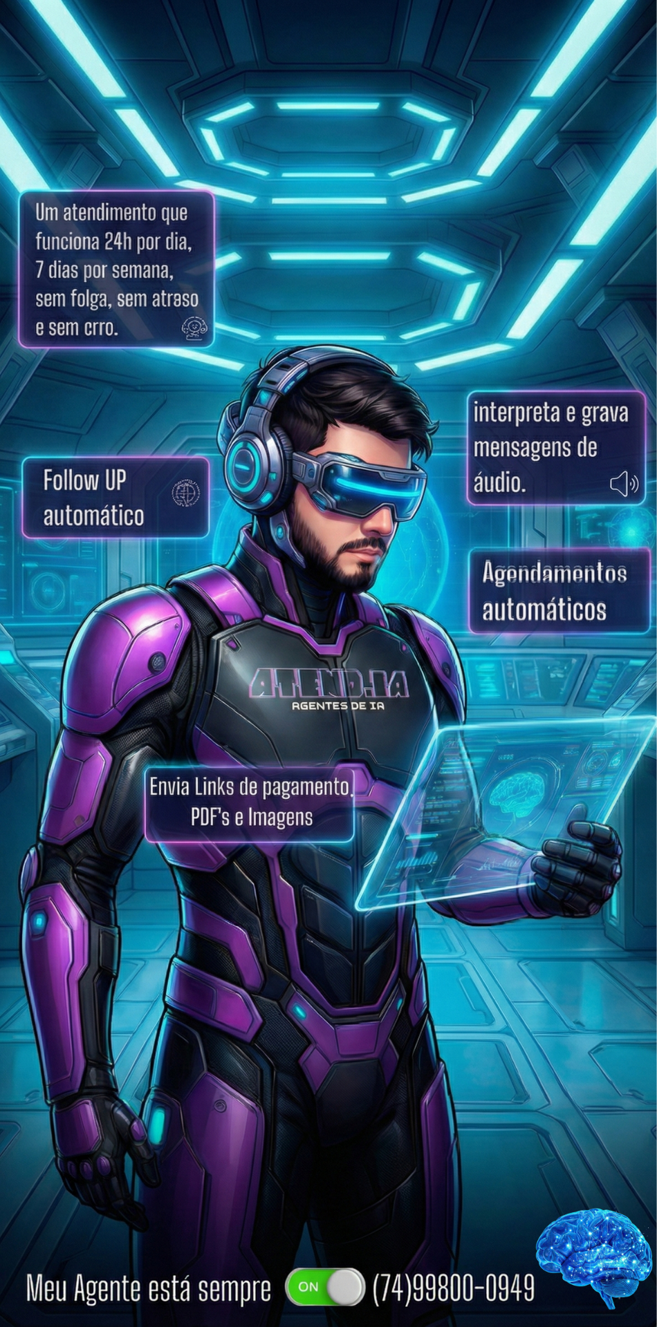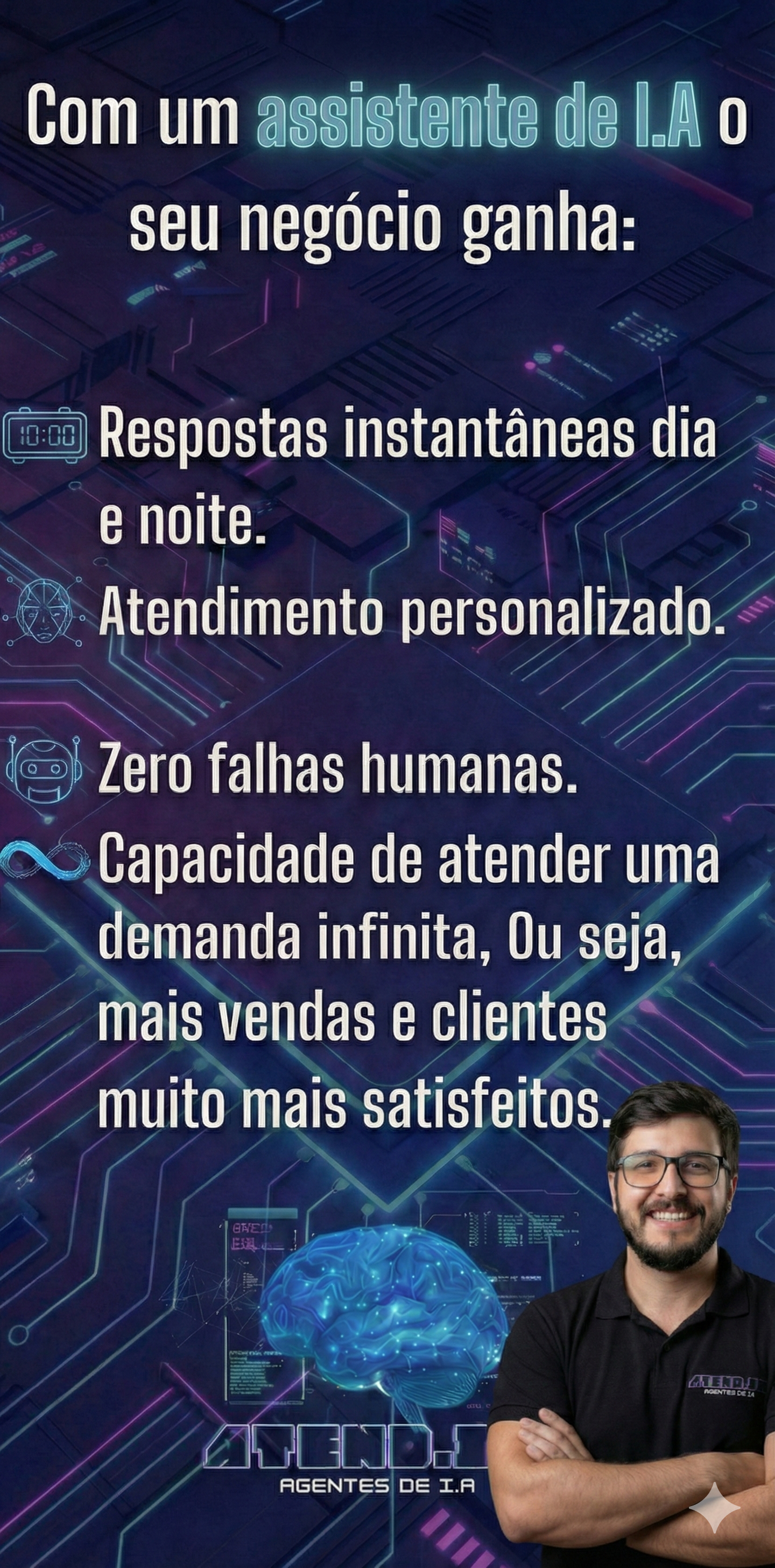 Enquanto você dorme, descansa ou foca no seu trabalho, o Agente de I.A está lá: apresentando seus horários livres, tirando dúvidas de valores e fechando a agenda.